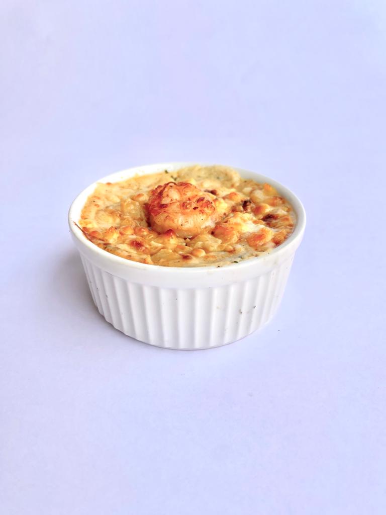 Pastel a base de camarones ecuatorianos, gratinado al horno. Porción individual 270g. Se entrega en pocillo de cerámica. Los pedidos se recibirán para los días 23 y 24 de diciembre.
