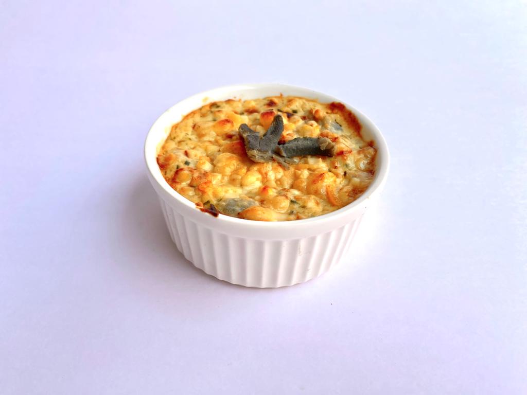 Pastel a base de carne de jaiba gratinado al horno. Porción individual 270g. Se entrega en pocillo de cerámica. Los pedidos se recibirán para los días 23 y 24 de diciembre.