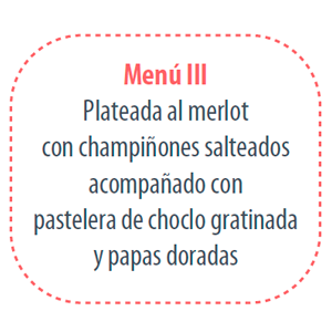 Cena Navidad para 1 persona que incluye: 1 Entrada a elección + Plateada al Merlot con Champiñones Salteados + Pastelera de Choclo Gratinada + Papas Doradas +1 Postre a elección. Revisar las opciones de Entradas y Postres al pie de esta página e indicar su preferencia en la casilla de "Observaciones" al momento de hacer el pago. Sólo se recibirán pedidos para los días 23 y 24 de diciembre. Los horarios de entrega ya se encuentran configurados en este sitio para esos días.